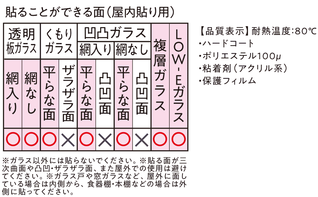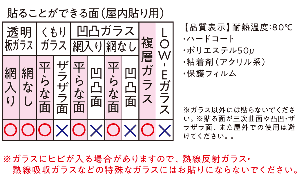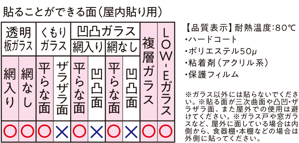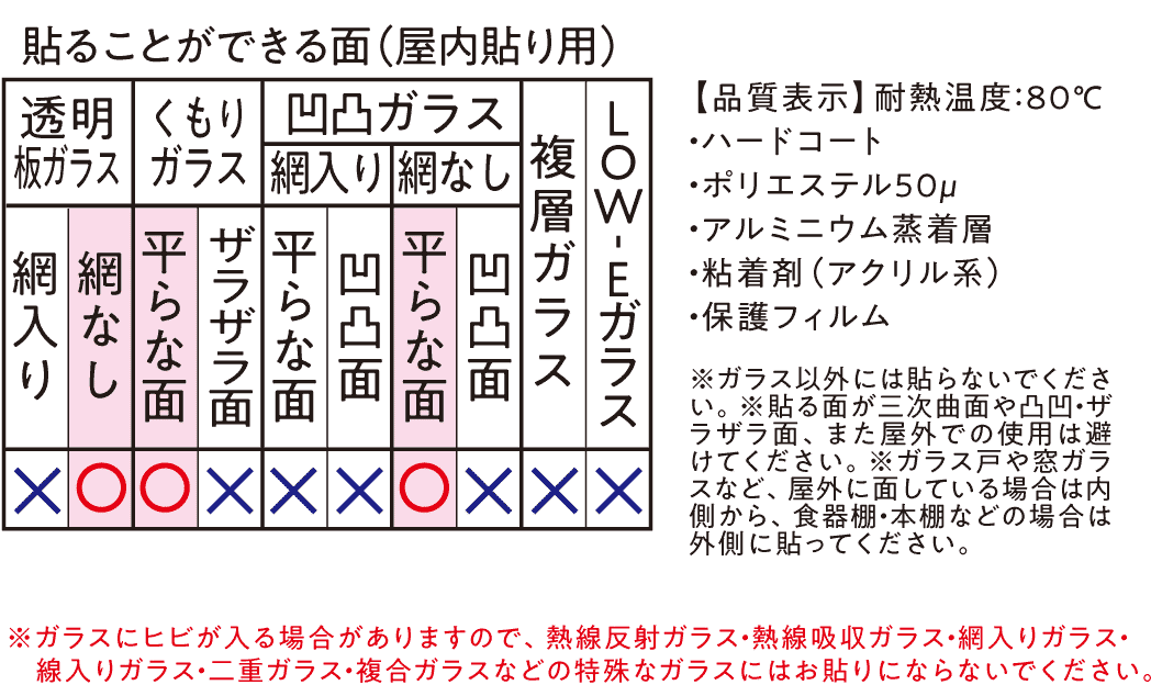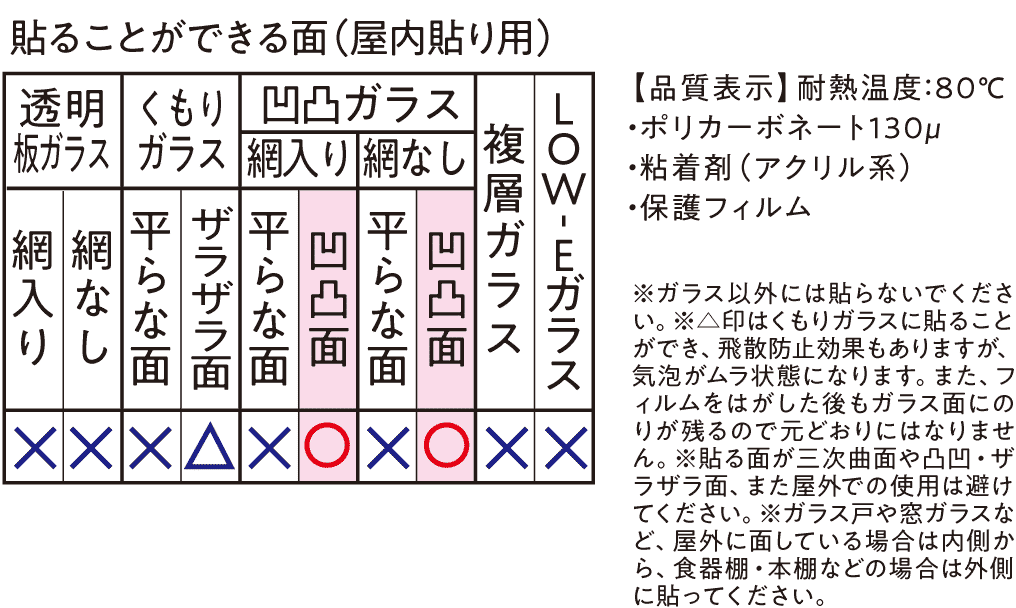 特殊粘着素材を使った凸凹ガラス専用の防災フィルム。貼っても凸凹ガラスの目かくし効果はそのまま。そのまま貼れるシールタイプです。UV99%カット。