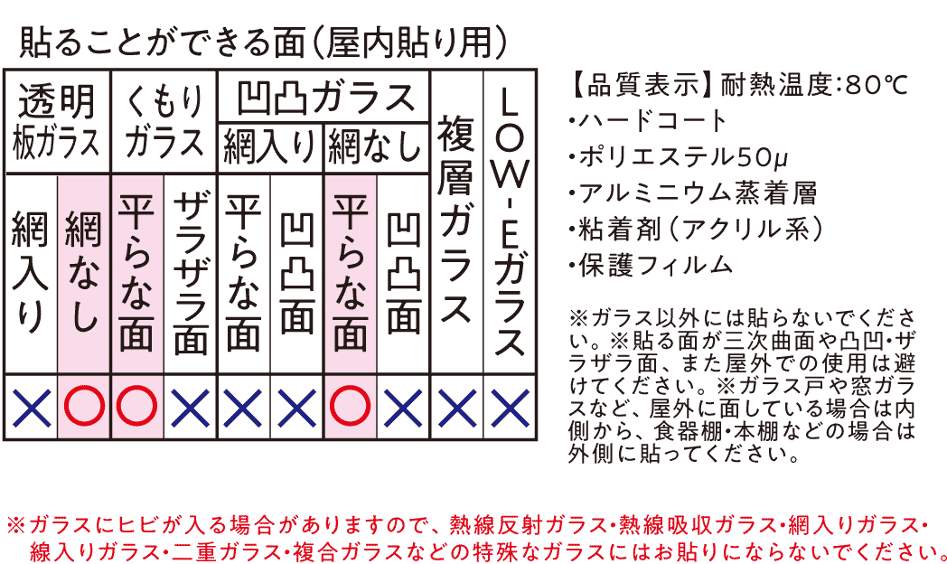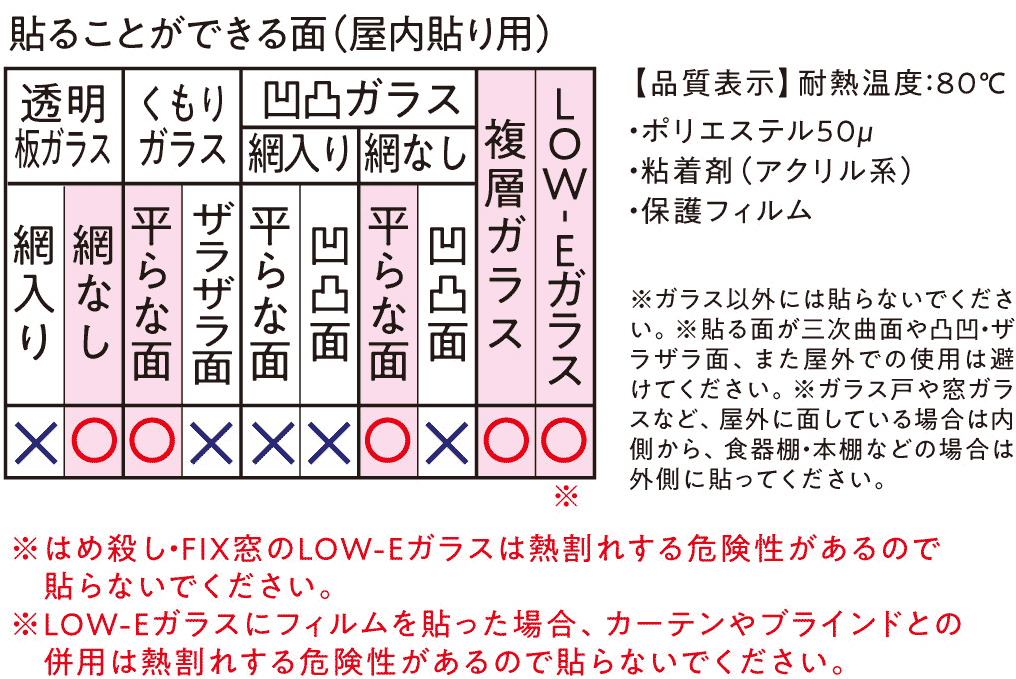 熱を吸収しにくいタイプのシートなので、LOW-Eガラス、複層ガラス、網入りガラスなど特殊なガラスにも貼れる目かくしシートです。UPF50+。