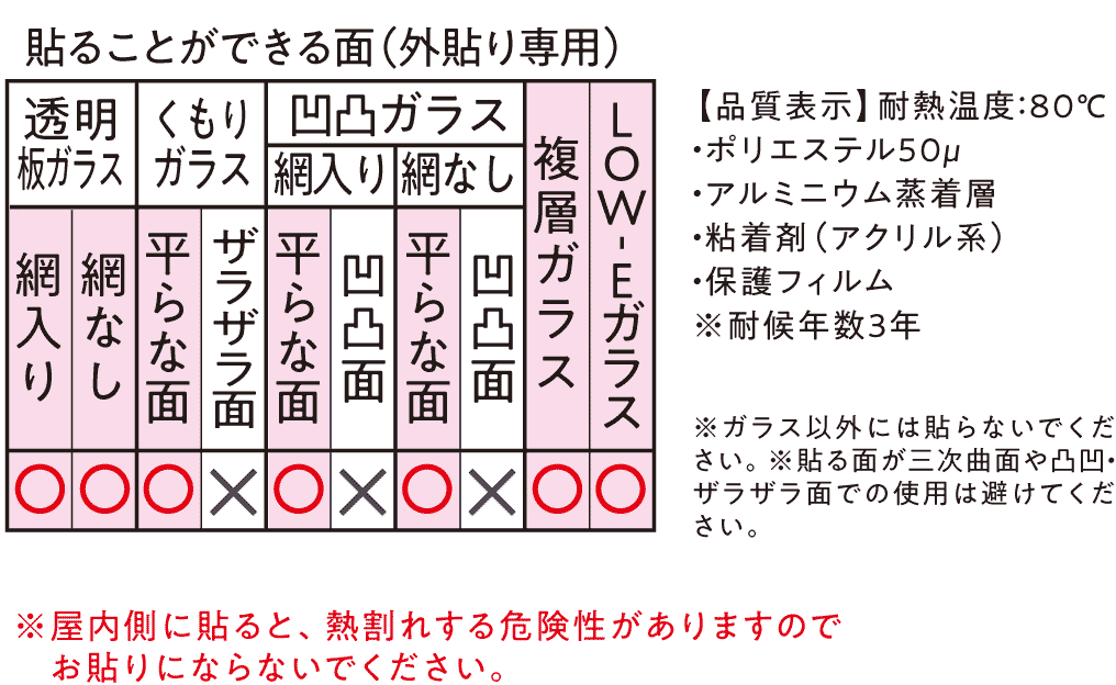 外貼り専用のマジックミラータイプで、熱割れの恐れがある網入りガラス、複層ガラス、LOW-Eガラスにも貼る事ができます。夏の冷房効果をアップします。マジックミラー効果で目隠し機能付き。ガラスが割れても飛び散らない飛散防止効果。UV99%カット。